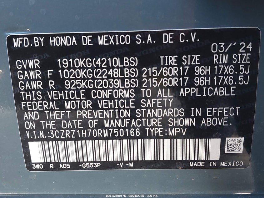Honda hr-v 2wd ex-l/2wd ex-l w/o bsi 2024